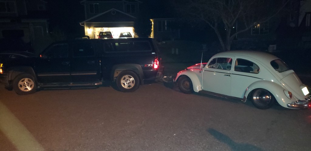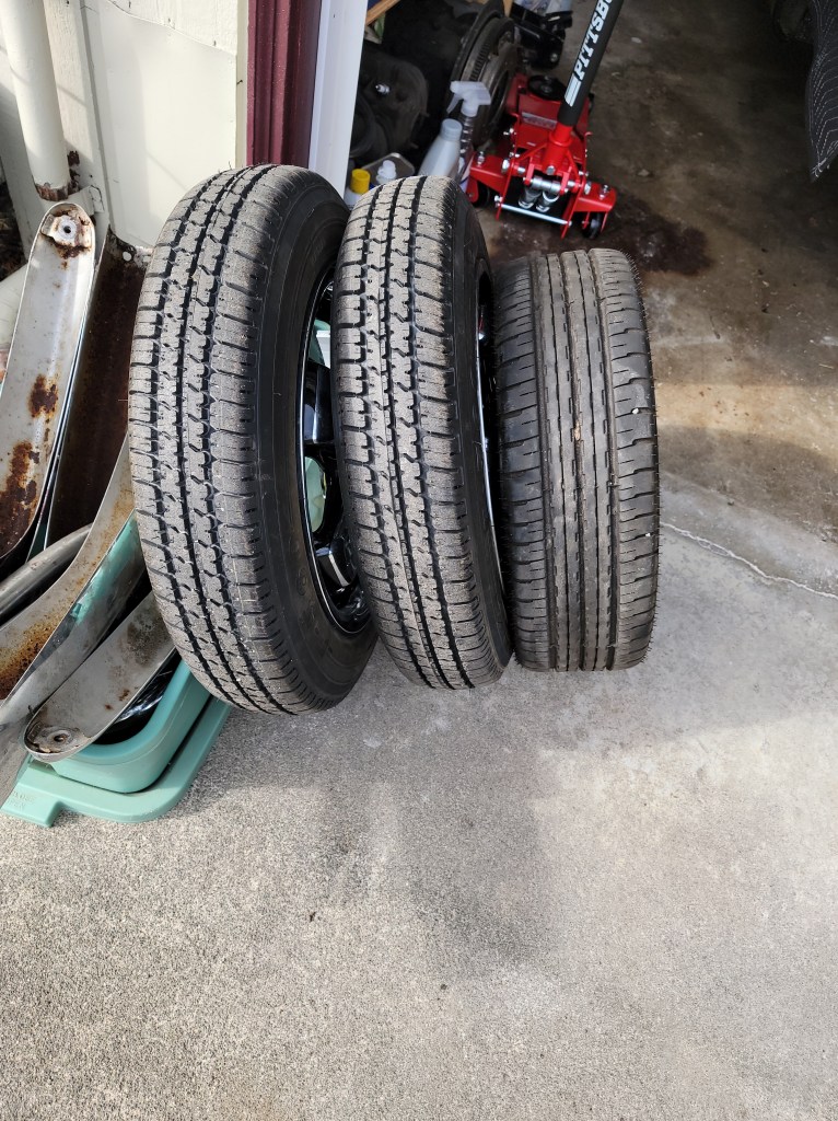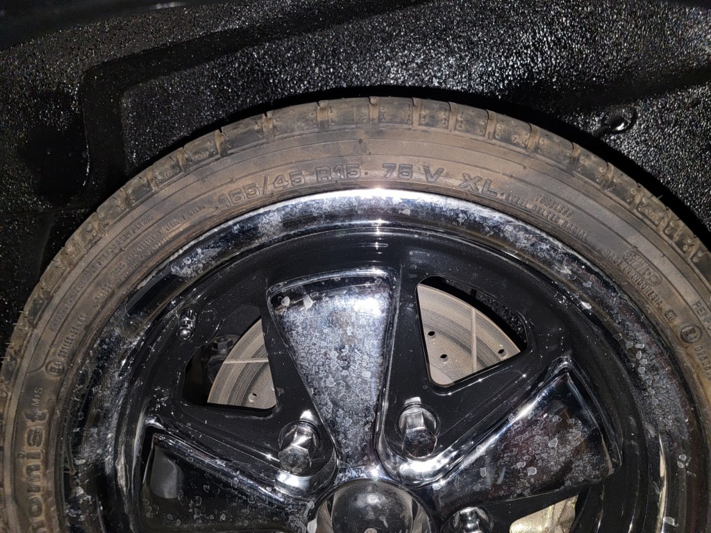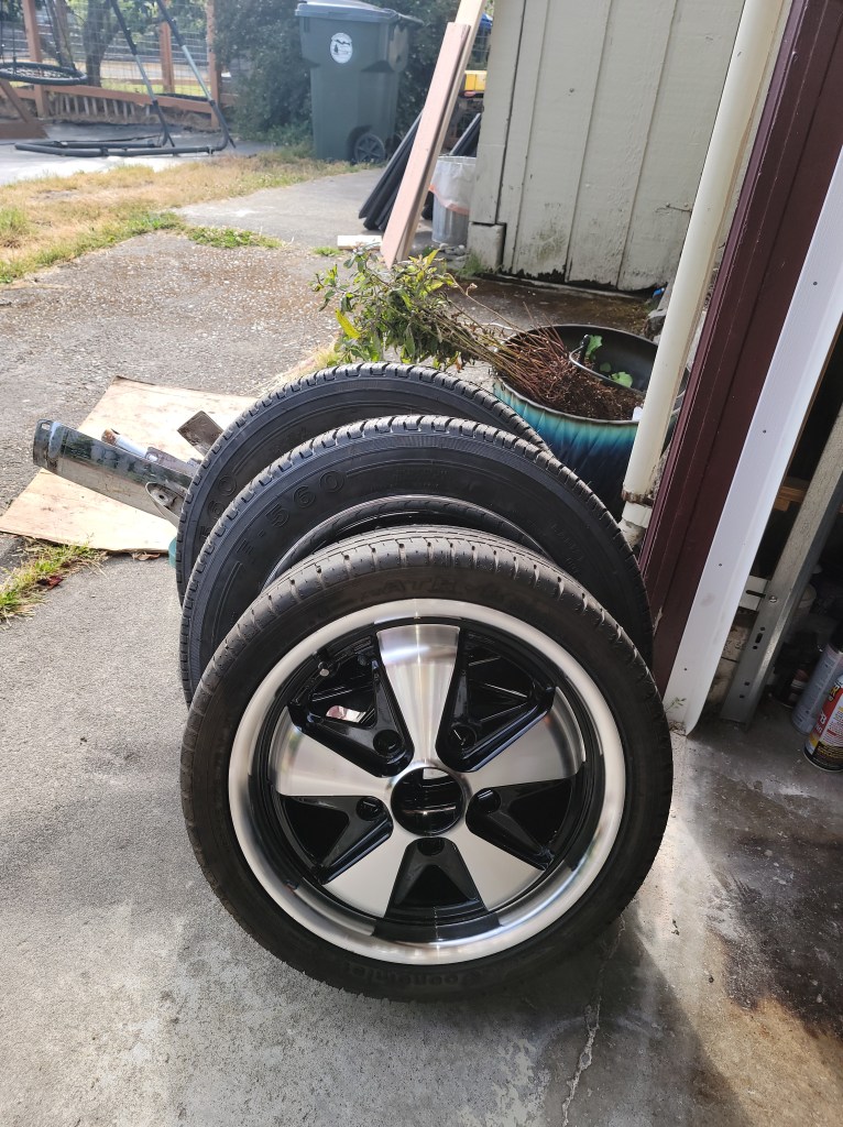 I wasn’t loving the 135 wheels up front, because they look so narrow, so I replaced them with 165/45 15’s. I’m going to have to raise the front beam a bit due to the smaller tires.