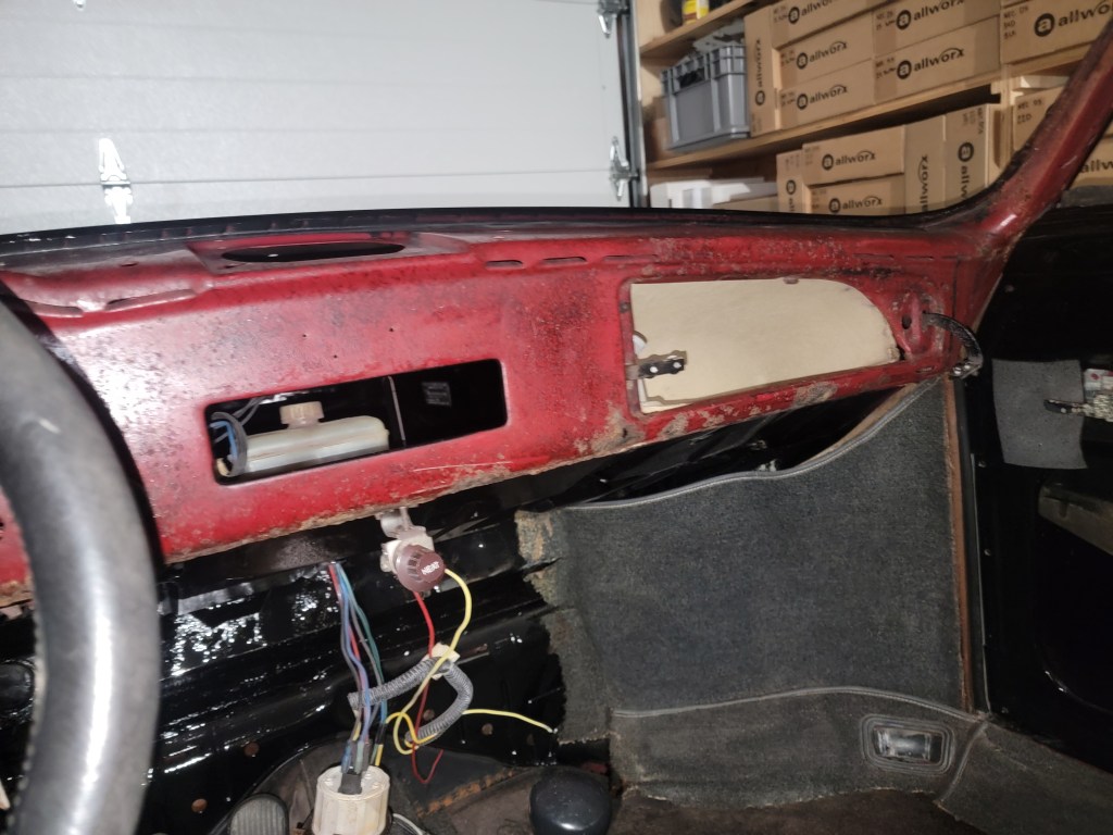 I removed the plastic dash face and sadly found some rust underneath it. I had been considering just paining the dash, but that is not a good option at this point. Removed and treated the rust, and then POR-15’s most of the dash face and dash top. I will be installing the black plastic dash face soon.